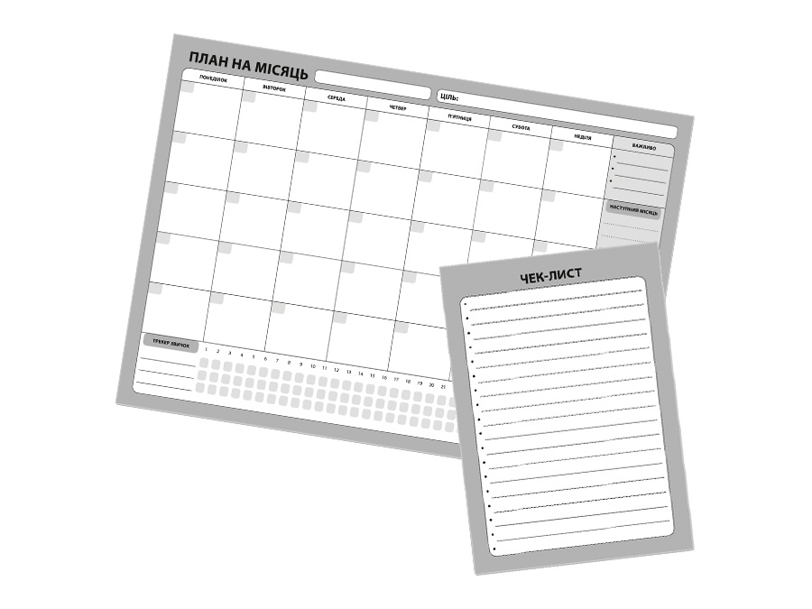 Комплект магнітних планерів “Плануй місяць” Gray складається з магнітного планера “План на місяць” Gray (А3, 30*42 см) і планера “Чек-лист” (А5, 15*21 см), які виконані в однаковому дизайні і прекрасно розширюють можливості вашого планування.